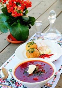 К борщу принято подавать свежую крестьянскую сметану, чтобы «ложка стояла». Прилежные хозяйки пекут пампушки на свежих дрожжах, поливая горячие пышки чесночным саламуром (смесь растительного масла, чеснока и зелени). Кто поленивее, натирает чесноком горбушку черного «бородинского» хлеба. Не лишними будут «русская» горчица, чеснок, зеленый и крымский лук, острый перчик, кусочек тонкого, прозрачного сала. Щедрые хозяйки к борщику наливают гостю стопочку «Медовой горилки с перцем».