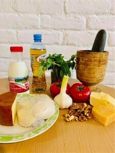 Шашкулави — разновидность базилика — ароматная зелень, которую вряд ли можно найти на украинских базарах. Поэтому используйте любой сорт базилика. Шашкулави, базилик — 50 г листьев без стеблей. Поджаренные грецкие орехи — 40 г. Пармезан — 20 г. Гуда — грузинский сыр — 20 г (можно заменить его на выдержанную овечью брынзу, пористую, твердую). Чеснок — два зубка. Соль — по вкусу. Кахетинское (жареное подсолнечное) масло — 80 г.