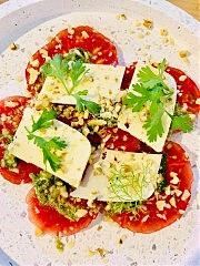 Крупный помидор сорта микадо 300 г, гуда — 100 г, песто из шашкулави — 4 столовые ложки, молотые грецкие орехи — 1 ст. л.