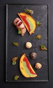 Мне удобно было сделать все дегустационные колбаски по 50 граммов. Это — оптимальная порция. Мы подаем колбаску с мармеладом из узбекской дыни, который я наварила еще летом. Думаю, в ваших погребках всегда найдется баночка любимого варенья. Оно прекрасно дополнит «ливерную» из утиной и перепелиной печени. Хрустящие тосты бриошь, сливочное масло трех вкусов и текстур… Здесь для фантазии кулинара есть разбег.