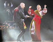 Респект изобретательности: вместо мешков в хате Солохи задействованы стеклянные боксы, замеченные ранее в «Коварстве и любви», а затем в «Собачьем сердце». И все получилось! Спрятанные герои отлично видны залу, каждая их ужимка смешит. А что черевичек в этой версии Оксане не досталось, так не беда: справит ей жених новые, незачем чужое донашивать, хоть бы и за царицей.