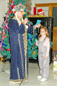 Детвора с интересом отгадывала загадки Снегурочки про зиму, про Деда Мороза, Рождество, и, конечно, каждый спешил получить свой заслуженный приз — вкусный подарок.