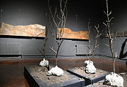 На втором этаже развернулась экспозиция харьковского скульптора Константина Зоркина «Защитный слой». У обитателей Харькова, конечно, беспрецедентный опыт жизни в военном городе. Дерево и металл, из которых сделаны скульптуры, по-своему говорят о желании ответить на внешнюю (авторскую также) агрессию: спрятаться или дать отпор, приспособиться к новым условиям или даже возродиться, расцвести после смерти. Форма истлевших листьев, которые состоят из одних почти прожилок, встречается едва ли не чаще всего.