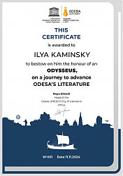 Як повідомила очільниця Офісу «Одеса — місто літератури ЮНЕСКО» Майя Дімерлі, розпочалася програма амбасадорів одеської літератури за кордоном. Для відзначення літературних дипломатів був розроблений сертифікат Одіссея. Його отримують одесити, що мешкають за кордоном, але мають значні досягнення у сфері літератури, або присвятили свою діяльність сфері культури. Або готові вкласти свої зв’язки, енергію, креативність та добру волю до руху, який сприяє впізнаваності Одеси, її літературних традицій та сучасних письменників у світі.