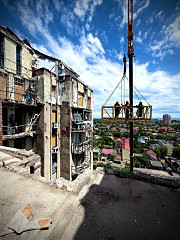 Що відбувається за цією адресою сьогодні? За повідомленням пресслужби міськради, з 16 травня на постраждалому об’єкті працює попередньо замовлений спеціальний кран вантажопідйомністю 250 тонн. Роботи зі стабілізації будинку тривають, за планом до 10 червня мешканці першого під’їзду матимуть змогу повернутися до своїх квартир. Щодо другого під’їзду, у верхні поверхи якого влучив ударний безпілотник, то після завершення протиаварійних робіт та стабілізації буде розроблено проєкт капітального ремонту, зазначають в міськраді. Очільниця Київської райадміністрації Марина Лозовенко повідомила, що на весь період мешканцям будинку пропонується компенсація на оренду житла з міського бюджету.