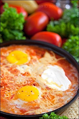 2 перца чили, 2 сладких перца, 4 помидора, 1 луковица, 1 зубок чеснока, 4 яйца, 2 ст. ложки сметаны, 2 ст. ложки тертого сыра, соль,…