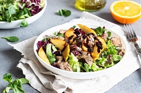 Ингредиенты: печень куриная — 400 г, 1 груша, салат микс, зелень (по вкусу), 1 апельсин, 3 веточки тимьяна, сыр фета или мягкий козий сыр по…