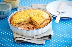 12 блинчиков, 300 г слабосоленой или свежей семги, 300 г шампиньонов, 1 луковица, 120 мл жирных сливок, 50 г сыра, несколько веточек тимьяна и петрушки,…