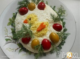 В основе этого салата — ветчина, можно использовать любую колбасу, которую любите. Главное в блюде — оформление. Делаем цыплёнка из вареного желтка, украшаем цветными перепелиными…