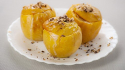 Яблоки с медом и орехами Два яблока нарезать кружками, удалив середину. Огнеупорную форму смазать маслом. Уложить слой яблок, помазав их медом (на блюдо потребуется одна…
