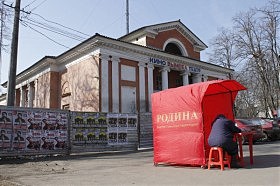 Партия «Родина» выставила палатку с партийной символикой под стенами кинотеатра «Вымпел», где собираются подписи под требованием «спасти сквер». Александр Васильев, депутат горсовета от партии «Родина»,…