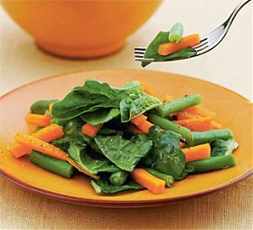 350 г молодой моркови, горсть замороженной зеленой стручковой фасоли, 2 средних пучка молодых листьев шпината, 1 зубчик чеснока. Для заправки: 2 ч. л. соевого соуса,…