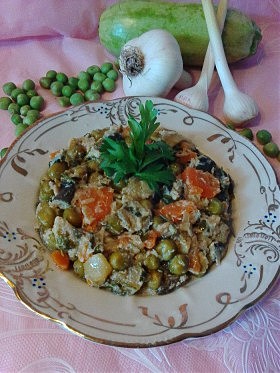 Морковь молодая — 3 шт., лук репчатый — 1 шт., горошек зеленый — 2 стакана, майонез домашний — 3 ст. л., соль — 1 щепотка,…