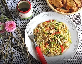 Куриное филе — 300 г, перец сладкий красный — 0,5 шт., морковь — 1 шт., цукини — 0,5 шт., горошек зеленый — 1 горсть, чеснок…