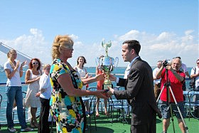 Необычным было в этом году чествование волейболисток «Джинестры». Оно состоялось на борту катамарана «Хаджибей». Одесситки в минувшем сезоне добились впечатляющего результата — выиграли Кубок Украины…