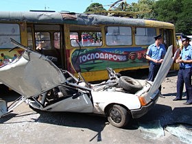 Трамвай сошел с рельсов и раздавил машину с водителем