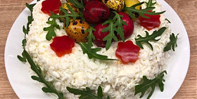 Зверху салат змастіть майонезом і поставте настоюватися в холодильник хоча б на годину. Перед подачею прикрасьте листочками петрушки, руколою і шматочками солодкого перцю. Тут вибір за вами. У центр викладіть крашанки. І якщо не хочете використовувати курку для салату — її цілком можна замінити вареною або запеченою яловичиною.